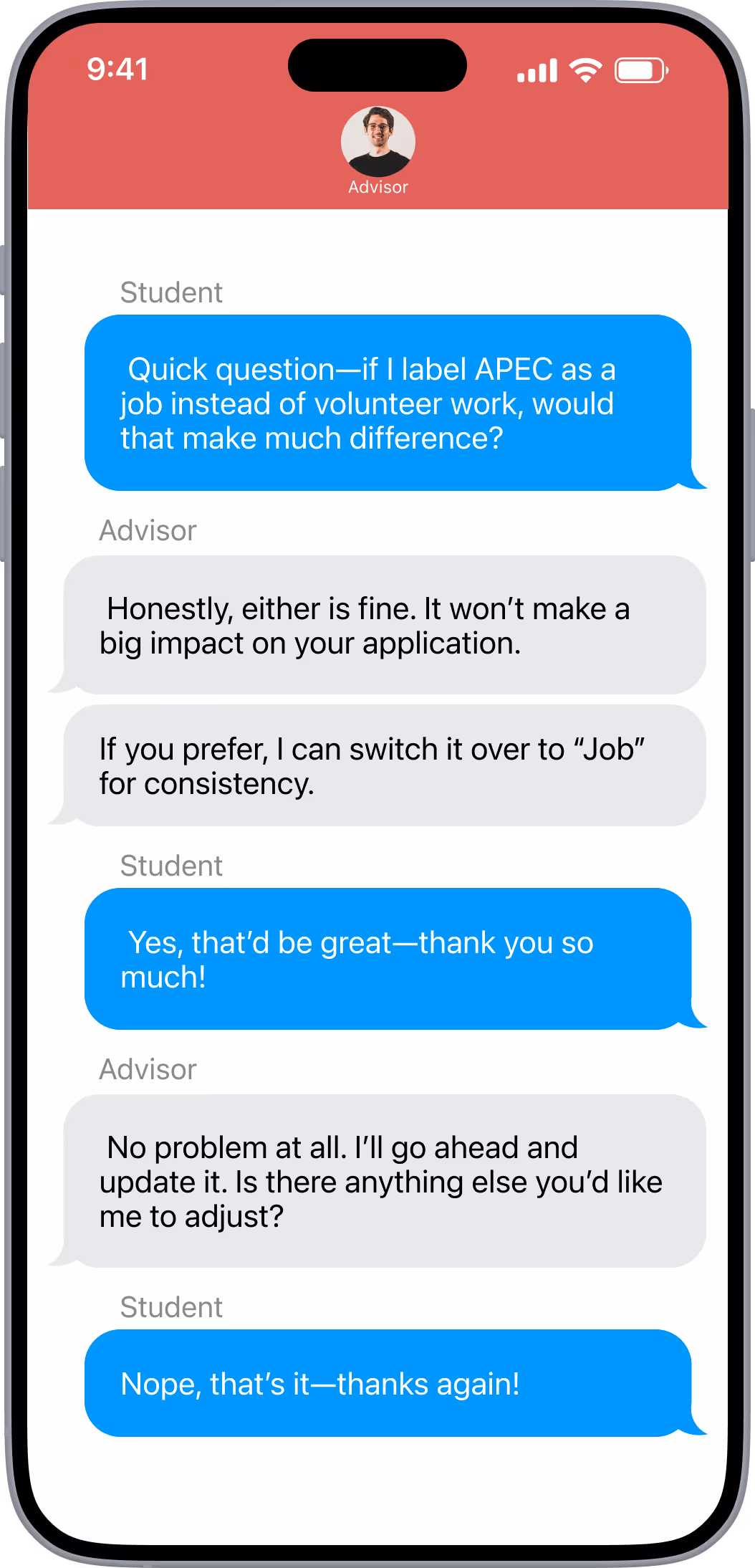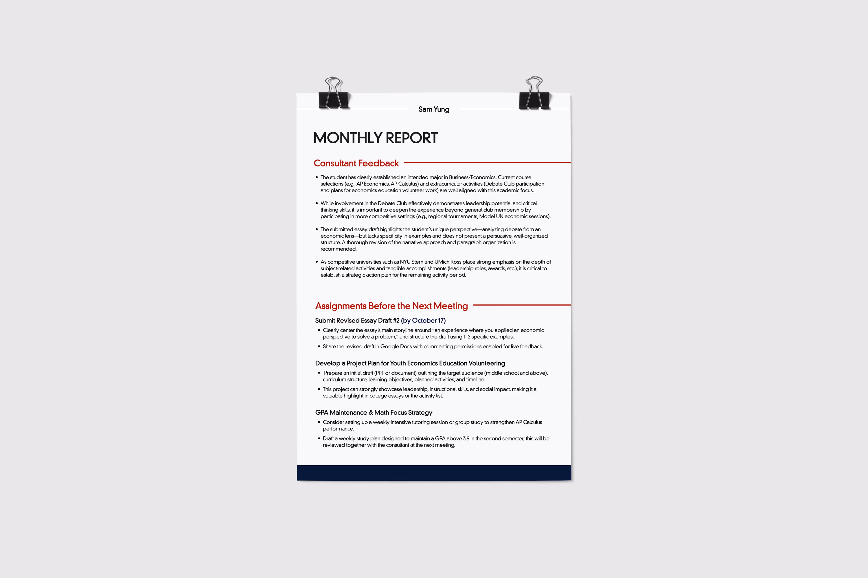 You’ll receive a detailed monthly progress report shared with both students and parents. This report summarizes meeting discussions, your current progress, upcoming plans, and outstanding assignments. You can also reach your advisor any time by phone, email, or messenger for additional questions.