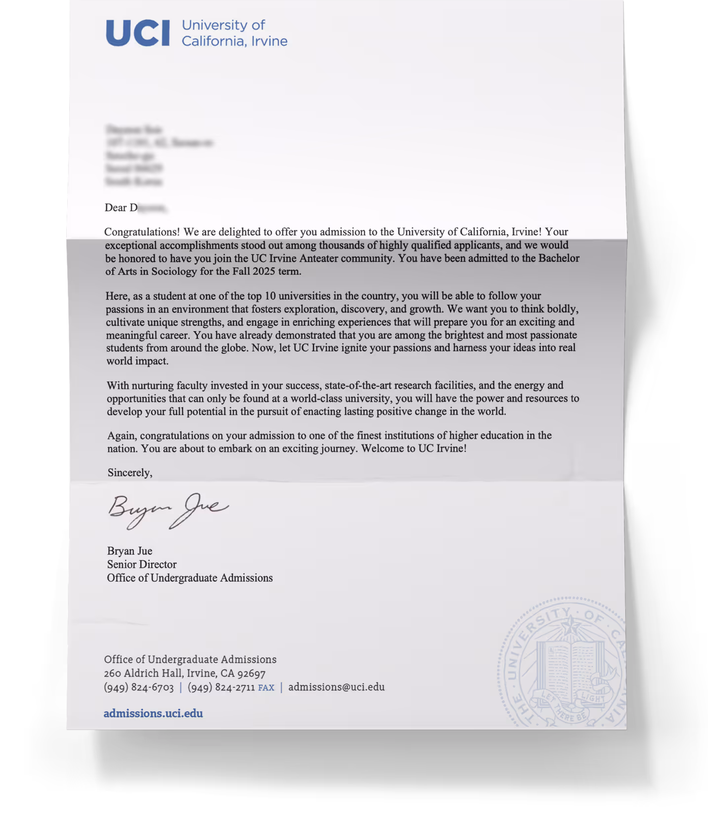 "My acceptance to UC Irvine was made possible through Harvest's dedicated support. Their structured guidance and expert feedback helped me present my best self."