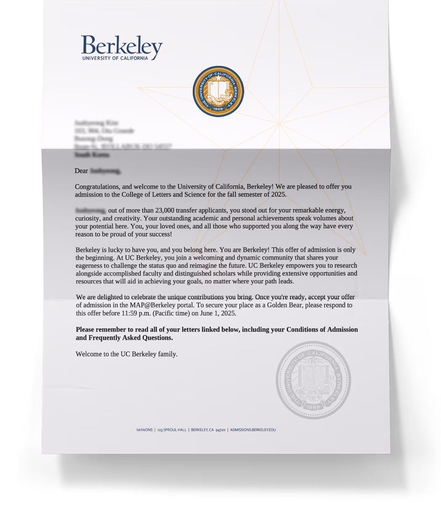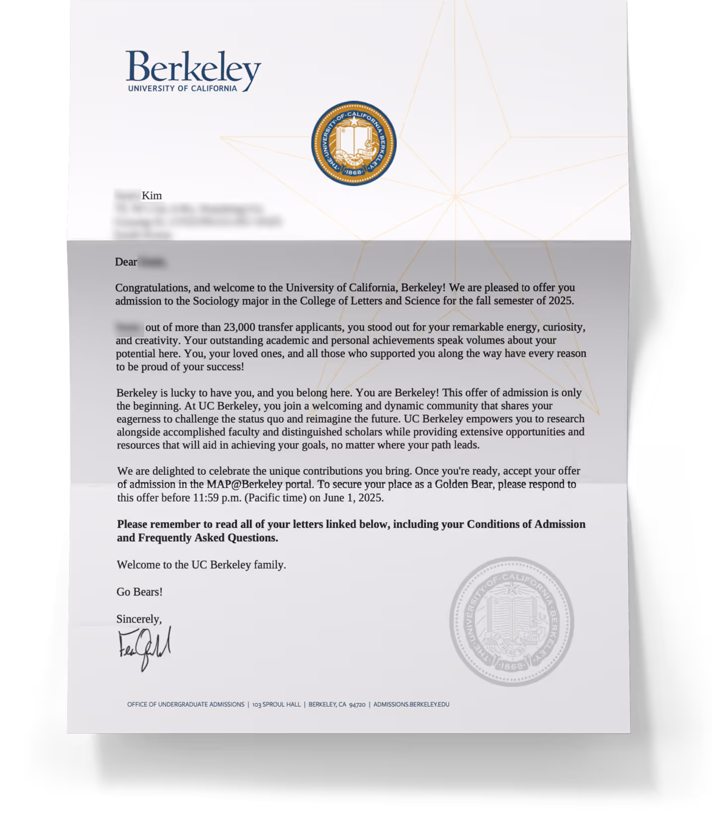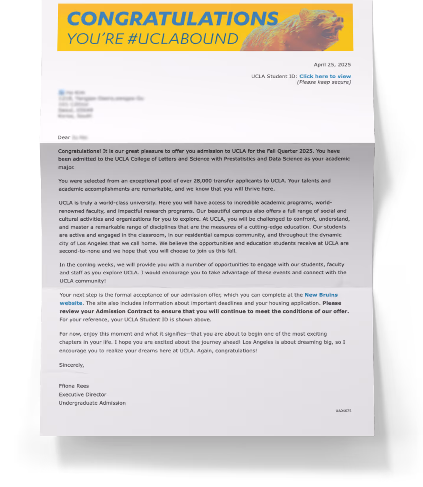 "With Harvest's expert mentorship, I achieved my dream of acceptance to UC Berkeley and UCLA. Their strategic insights and support were invaluable throughout this journey."