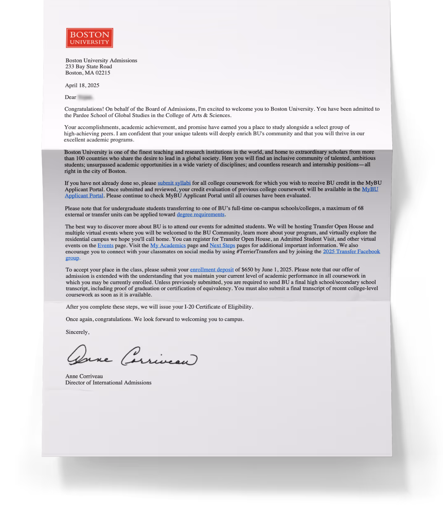 "Harvest helped me secure acceptances to Boston University, USC and NYU. Their personalized approach and strategic insights were crucial in achieving these competitive admissions."