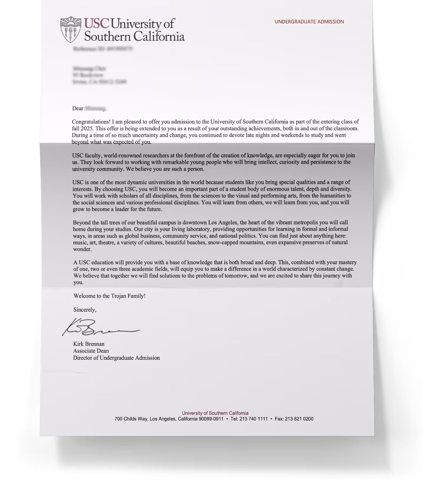 "Five top university acceptances including USC and multiple UCs - Harvest's comprehensive guidance made this possible. Their expertise in admissions strategy is unmatched."